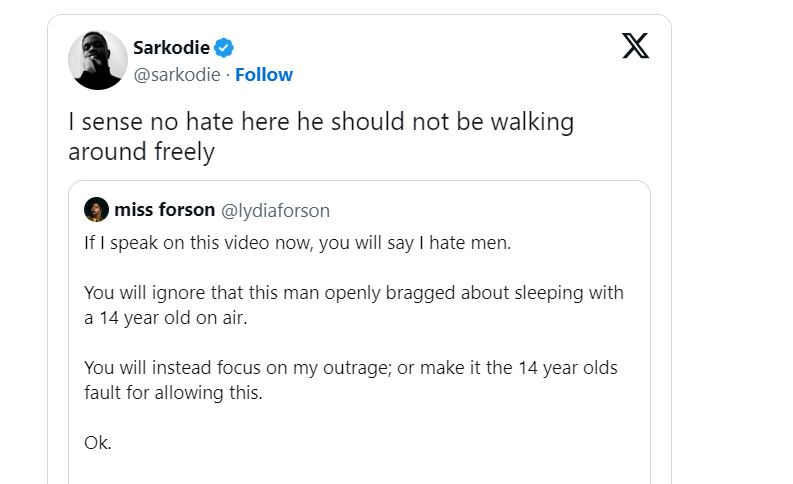 The video prompted immediate backlash, with Lydia Forson expressing her frustration on X (formerly Twitter). She criticized the societal tendency to deflect blame and focus on the outrage rather than the man’s admission, stating, “If I speak on this video now, you will say I hate men. You will ignore that this man openly bragged about sleeping with a 14-year-old on air.”