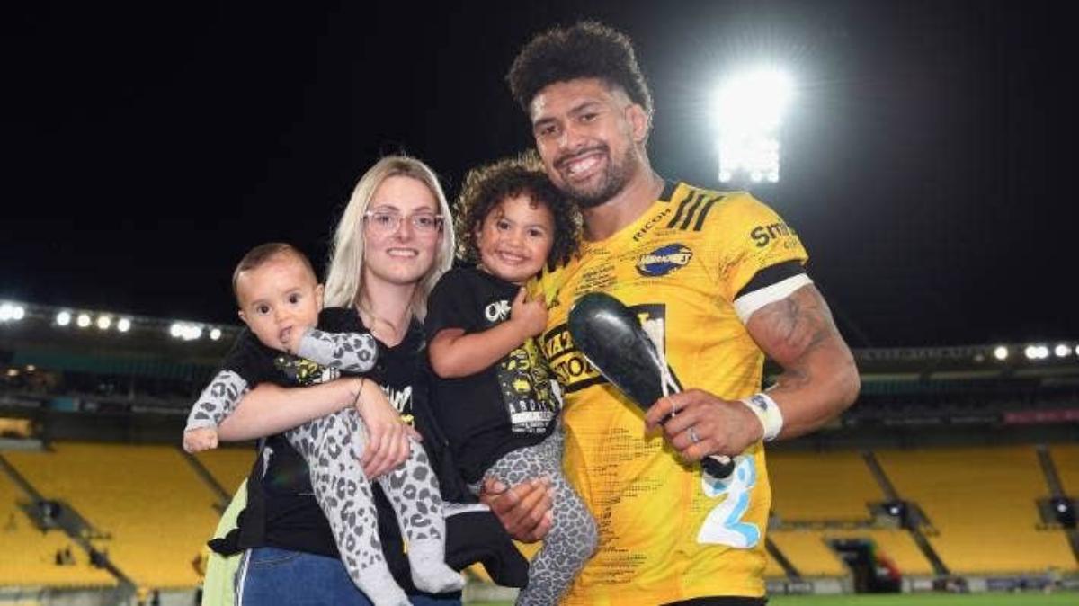 Ardie Savea with partner Saskia and children Keeon left, and Kobe after his 100th game for the Hurricanes in February 2021. All Blacks star Ardie Savea and wife Saskia have announced the birth of their third child, a son.