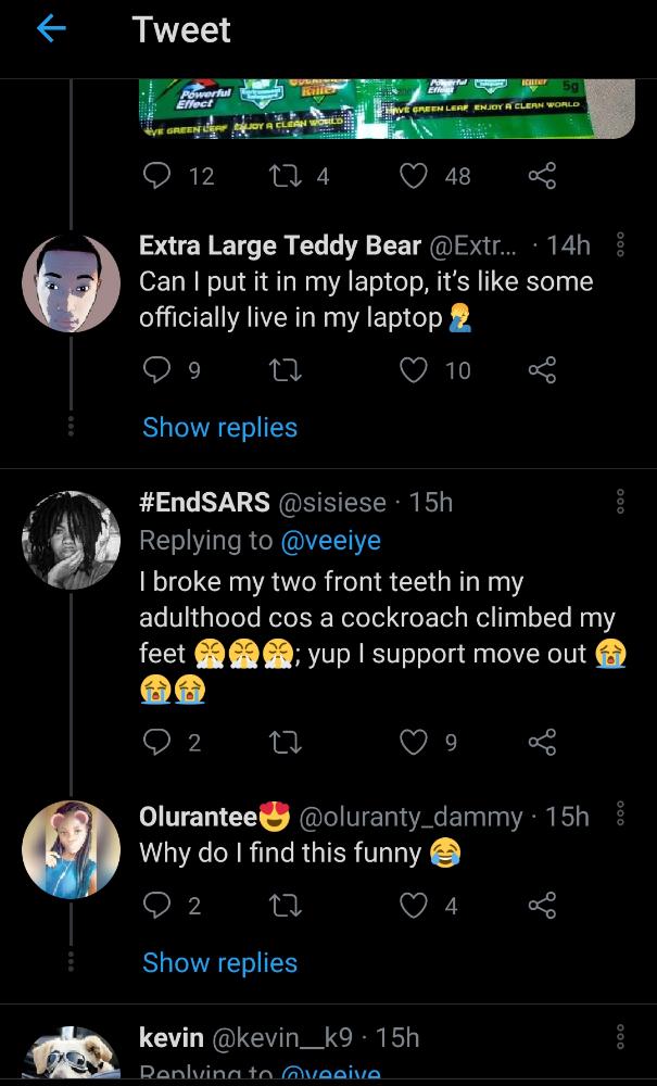 A fan who seems to agree with Vee moving out of the house took to the comment section and wrote, “I broke my front teeth in my adulthood cos a cockroach climbed my feet, yup I support move out”.