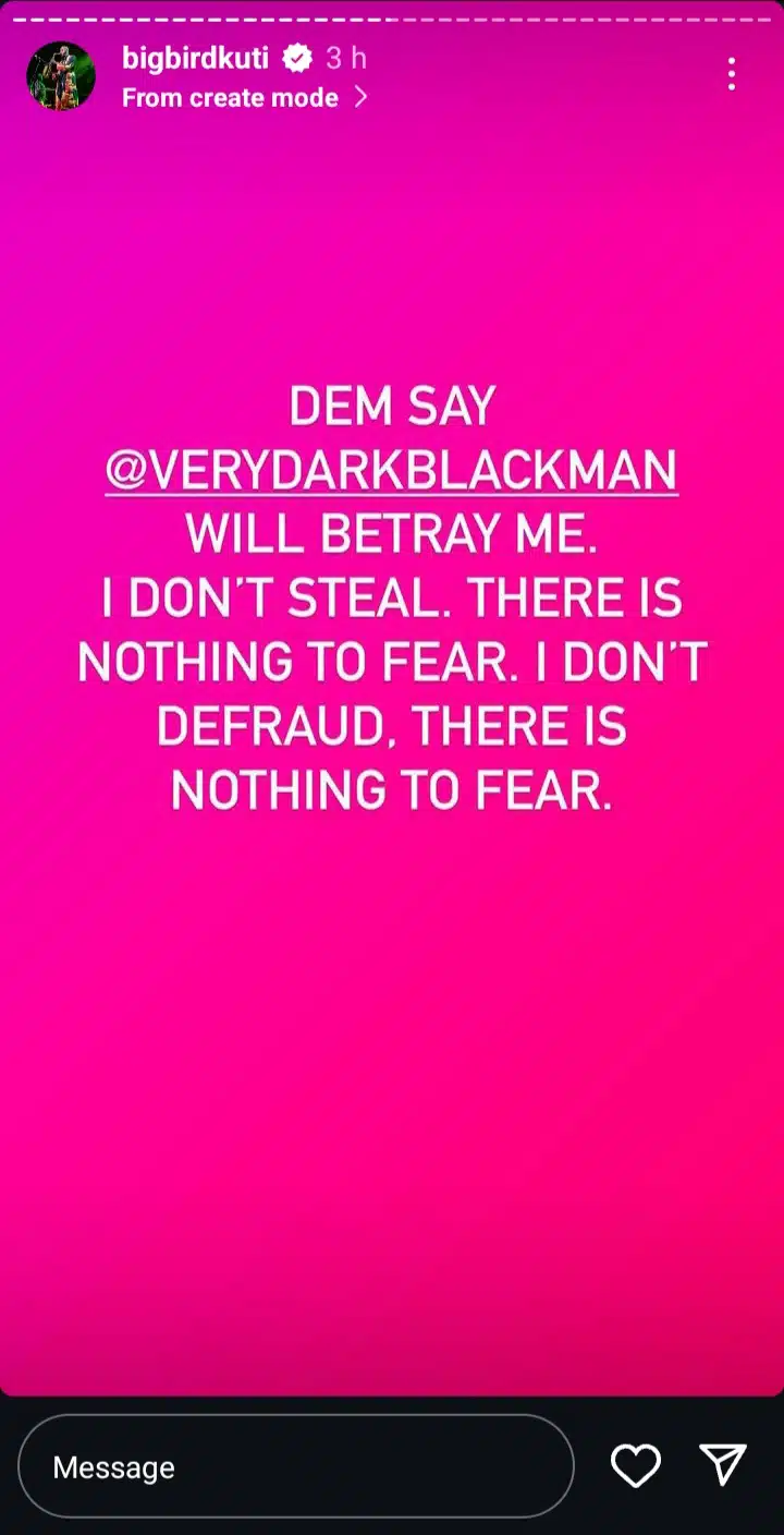“DEM SAY @VERYDARKBLACKMAN WILL BETRAY ME. I DON’T STEAL. THERE IS NOTHING TO FEAR. I DON’T DEFRAUD, THERE IS NOTHING TO FEAR,” Seun Kuti wrote in his post.