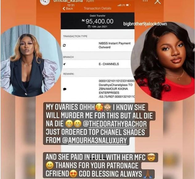 Ka3na Jones could not contain her joy after her former Big Brother Naija season five housemate Dorathy Bachor Patronized her business.