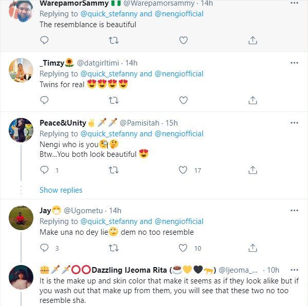 Reacting to this photo, some social media users opined that the lady looked more beautiful than Nengi. Others also believe there is no resemblance between them as the make-up makes them look more alike.