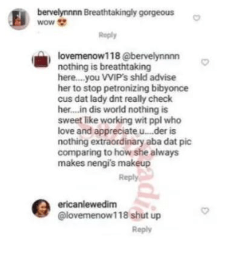 “nothing is breathtaking here…you VVIP’s should advise her to stop patronising bibyonce cus dath lady doesn’t really check her… in this world, nothing is sweet like working with people who love and appreciate you… der is nothing extraordinary to compare to how she always makes Nengi’s makeup.”