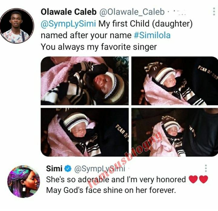 “@symplySimi, My first child (daughter) named after your name #Similola. You always my favourite singer”.