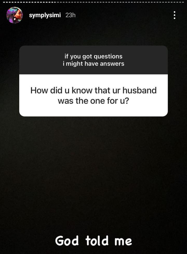 Simisola Kosoko, better known by her stage name Simi, was engaging her fans in a ‘Question and Answer’ session on her Instagram page and a fan asked her;