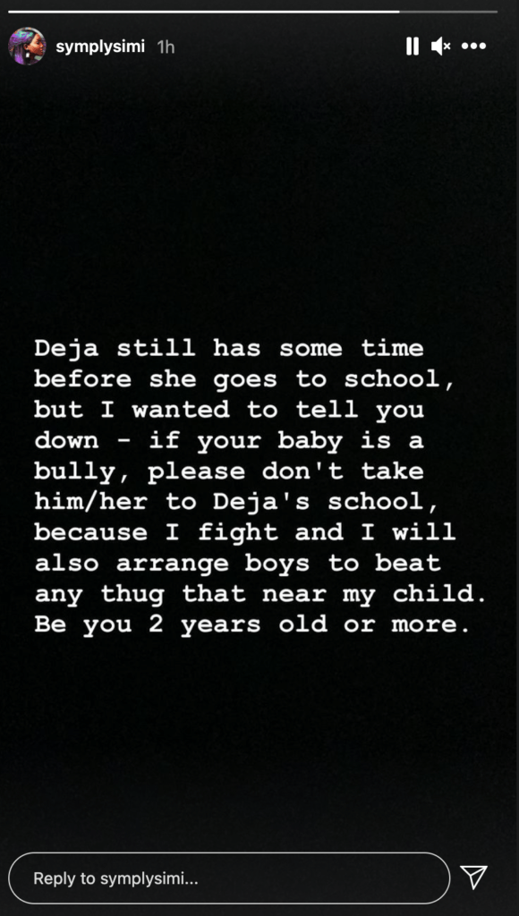 She wrote, “Deja still has some time before she goes to school, but I wanted to tell you down- if your baby is a bully, please don’t take him/her to Deja’s school, because I fight and I will also arrange boys to beat any thug that near my child. Be you 2 years old or more”.