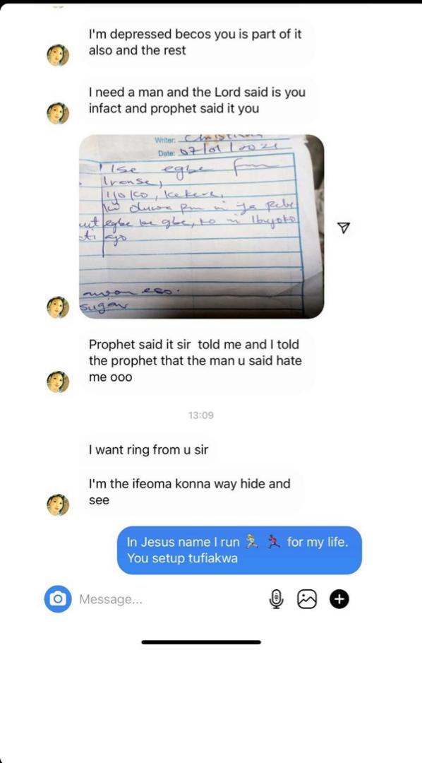 In the chat shared on Instagram, the lady who identified herself as Ifeoma, shared a note from her prophet, claiming the man of God told her that the singer, Harrysong was the man ordained for her.