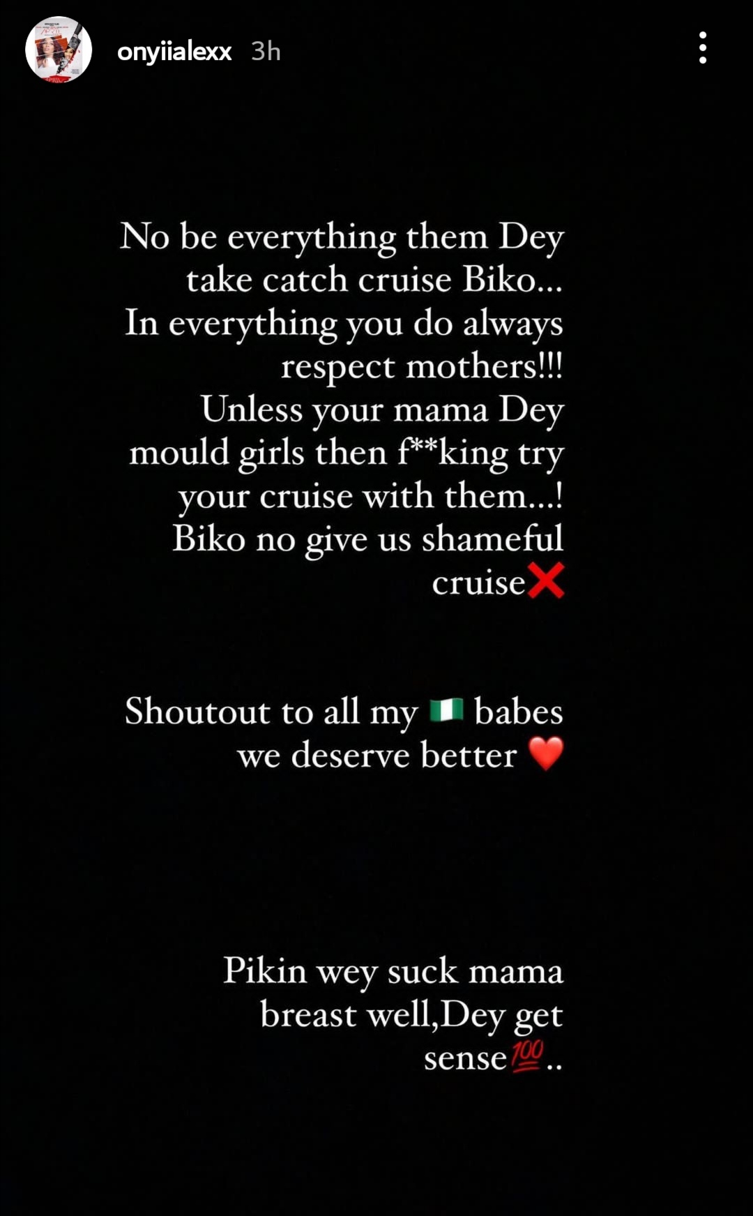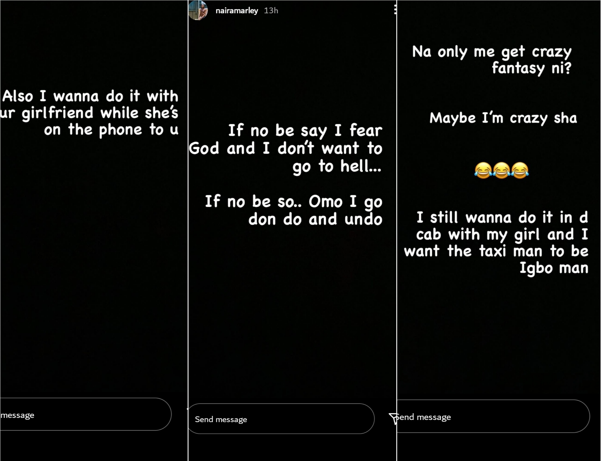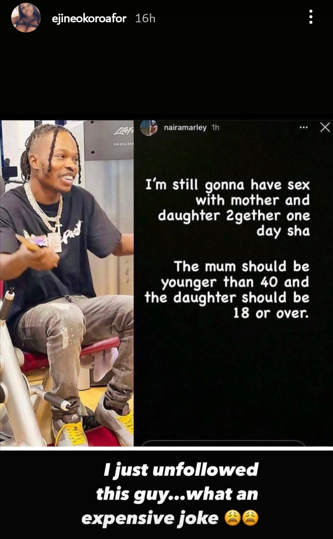 “I am still gona to have s*x with a mother and daughter together one day sha,” he wrote in his Instagram story, which he has since deleted.