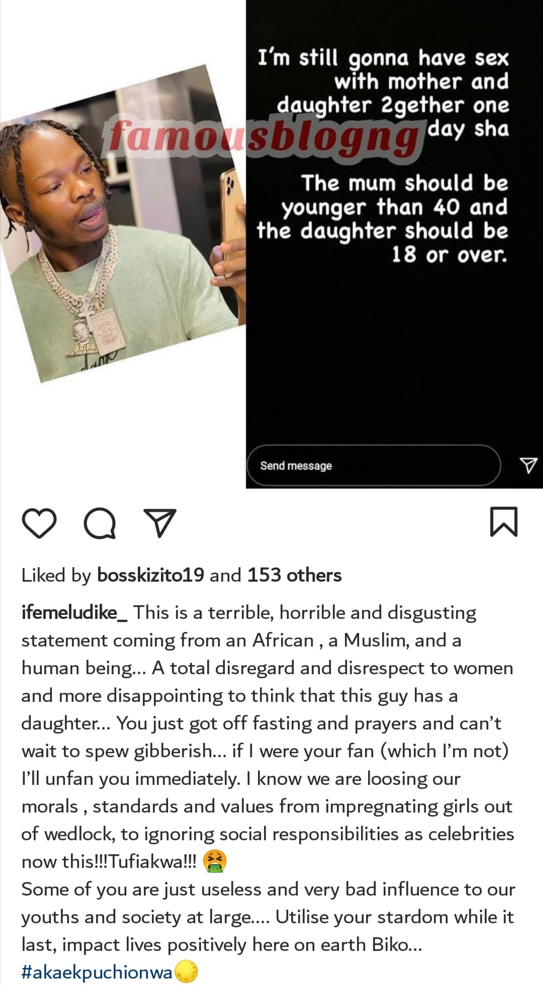 Actress, Ifemeludike, thought it was a “horrible and disgusting statement”, while Onyii Alex also asked the singer to respect women and Ejine Okoroafor thought his statement is an expensive joke and unfollowed him.