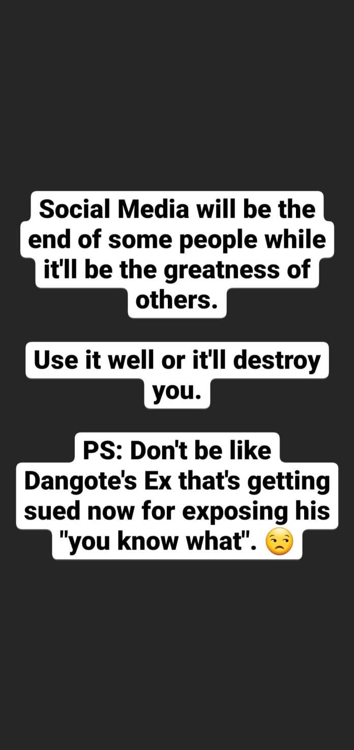 “Social media will be the end of some people while it will be the greatness of others…PS: Don’t be like Dangote’s Ex that’s getting sued now…”