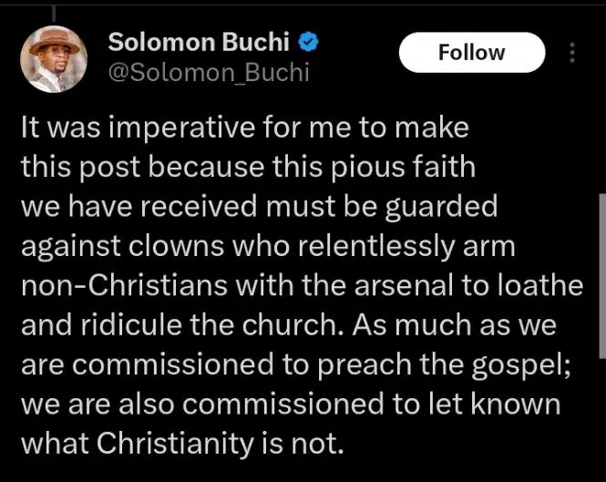 Buchi went on to explain that his motivation for the post was to protect the integrity of Christianity from what he perceives as charlatans who provide non-Christians with ammunition to criticize and ridicule the church.