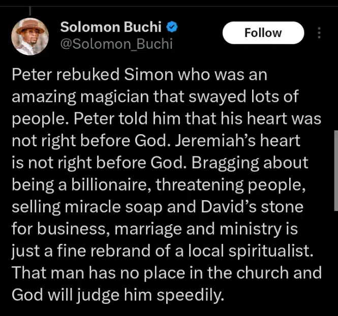 “Jeremiah Omoto Fufeyin is not a Christian let alone a prophet. He isn’t a man of God. He is a sorcerer working with a familiar spirit. He should be called out, rebuked, and arrested,” Buchi declared in his post. He expressed deep concern over the damage he believes Fufeyin is causing to the perception of Christianity, describing it as disgraceful and detrimental to the faith.