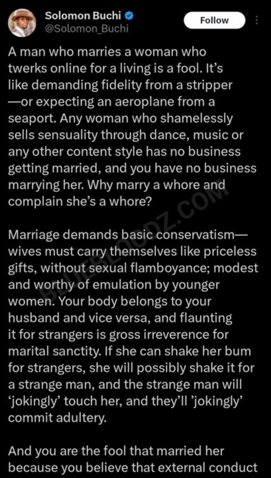 Nigerian writer and activist Solomon Buchi has ignited a fiery debate with his recent assertion that men who choose to marry women engaged in online twerking for financial gain are, in his view, acting foolishly. Buchi’s provocative stance has sparked widespread discussion, prompting reflection on societal norms, gender dynamics, and the complexities of modern relationships.