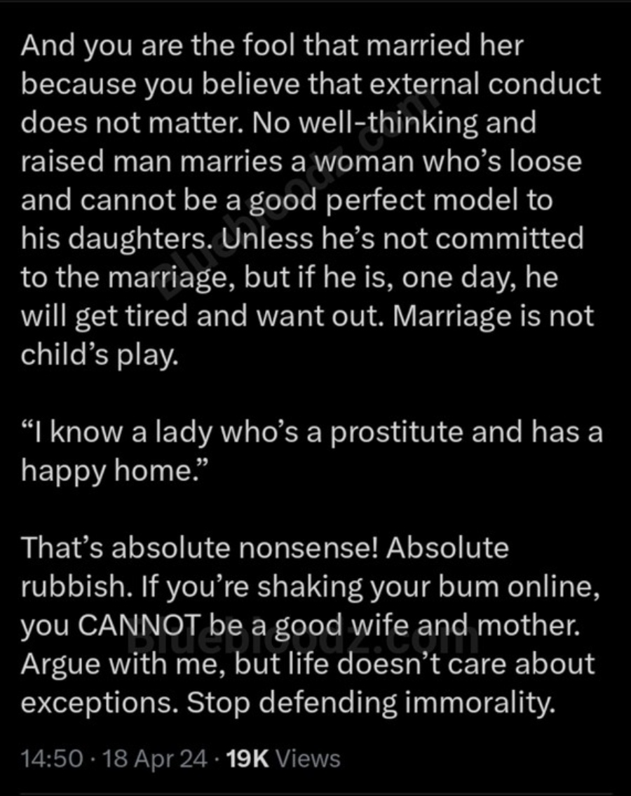 However, Buchi’s assertion has not been without its critics. Some have challenged the inherent judgment and moral absolutism embedded within his statement, arguing that it oversimplifies the complexities of individual relationships and overlooks the agency and autonomy of women engaged in online twerking as a means of livelihood. Others contend that such sweeping generalizations perpetuate harmful stereotypes and stigmatize individuals based on their chosen professions.
