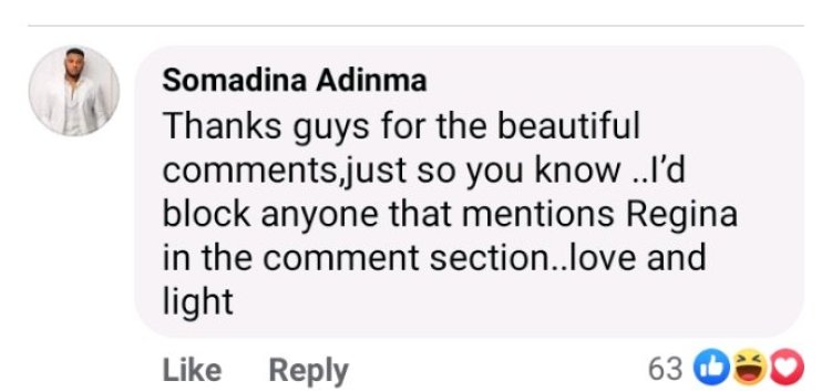 This was made known in a post sighted on his Facebook page where he wrote, “Thanks guys for the beautiful comments, just so you know… I’d block anyone that mentions Regina in the comment section…love and light”.