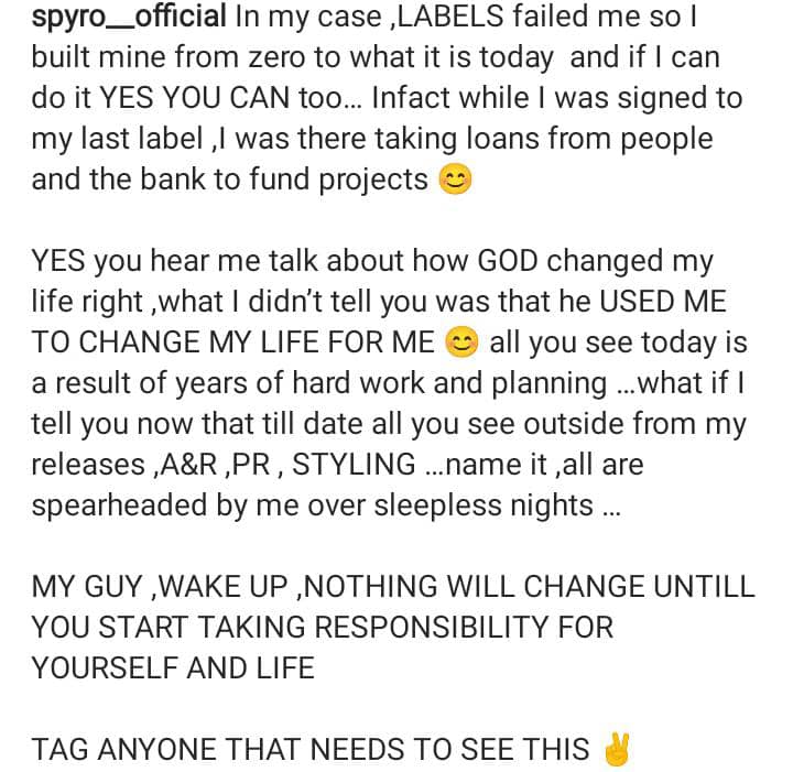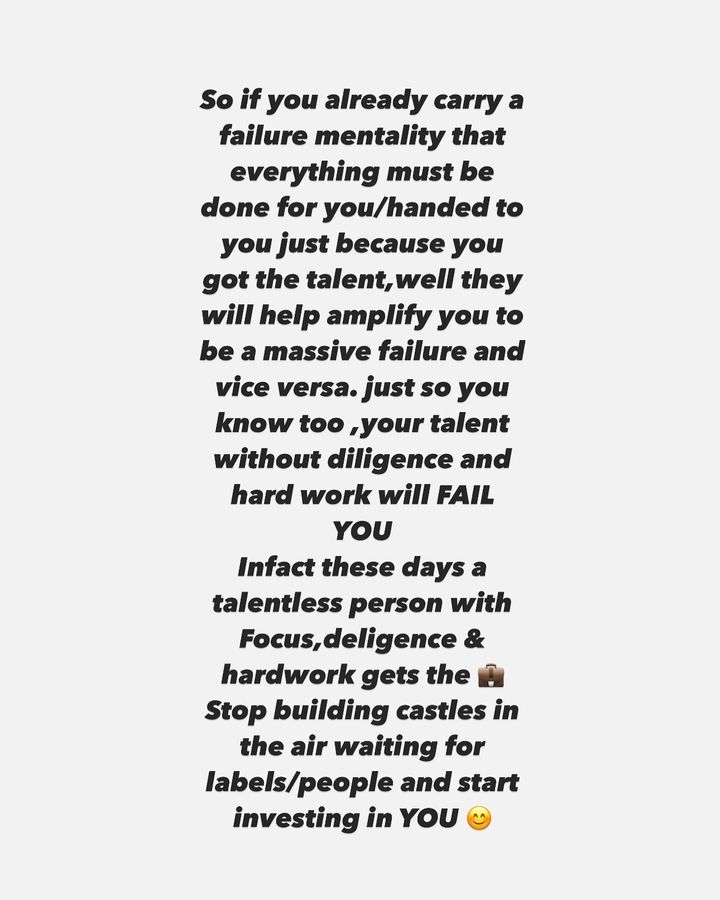 “So if you already carry a failure mentality that everything must be done for you/handed to you just because you got the talent, well they will help amplify you to be a massive failure and vice versa. just so you know too,your talent without diligence and hard work will FAIL YOU Infact these days a talentless person with Focus,deligence & hardwork gets the Stop building castles in the air waiting for labels/people and start investing in YOU”
