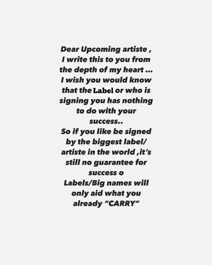 “Dear Upcoming artiste, I write this to you from the depth of my heart… I wish you would know that the Label or who is signing you has nothing to do with your success.. So if you like be signed by the biggest label/ artiste in the world,it’s still no guarantee for success o Labels/Big names will only aid what you already “CARRY”