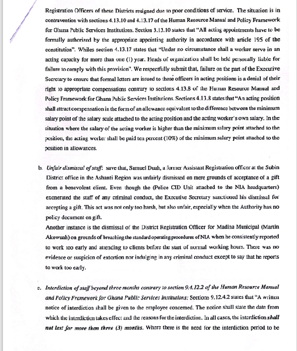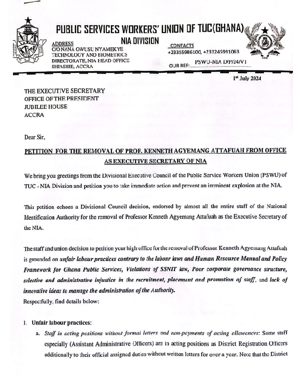 The National Identification Authority (NIA) Division of the Public Services Workers Union of the Trades Union Congress (TUC) Ghana has formally petitioned President Nana Addo Dankwa Akufo-Addo to dismiss Professor Kenneth Agyemang Attafuah from his role as the Executive Secretary of NIA.