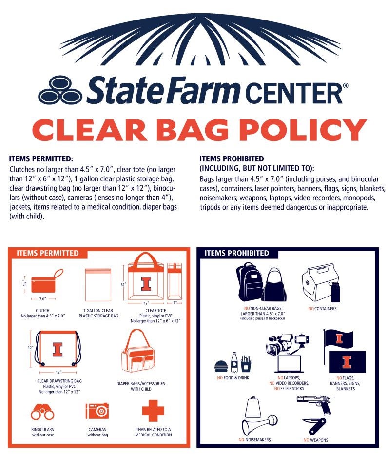 Fans attending events at State Farm Center will be allowed to bring one clear plastic or vinyl bag no larger than 12″x6″x12,” one clear drawstring bag no larger than 12″x12,” or one one-gallon clear plastic or zip-lock bag.