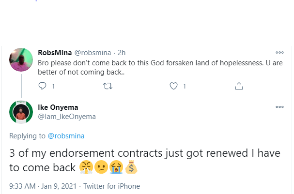 A fan reacting to the tweet encouraged him to remain outside what he described as a God-forsaken country, and responding to the fan, the reality star said three of his endorsement contracts just got renewed so he has to come back to Nigeria.