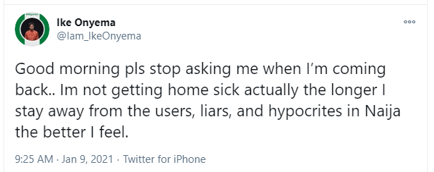 “Good morning pls stop asking me when I’m coming back.. Im not getting home sick actually the longer I stay away from the users, liars, and hypocrites in Naija the better I feel,” he tweeted.