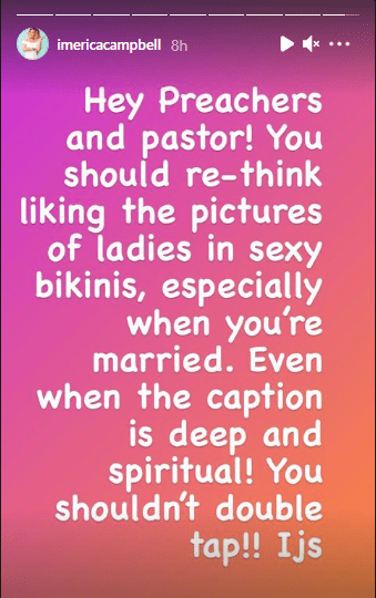 “Hey Preachers and pastor! You should re-think liking the pictures of ladies in sekxy bikinis, especially when you’re married Even when the legend is deep and spiritual! you should not double tap,” she wrote.