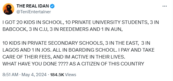 Through her post on Twitter, Teni emphasized her active involvement in the lives of these children, highlighting her dedication to their well-being and education.