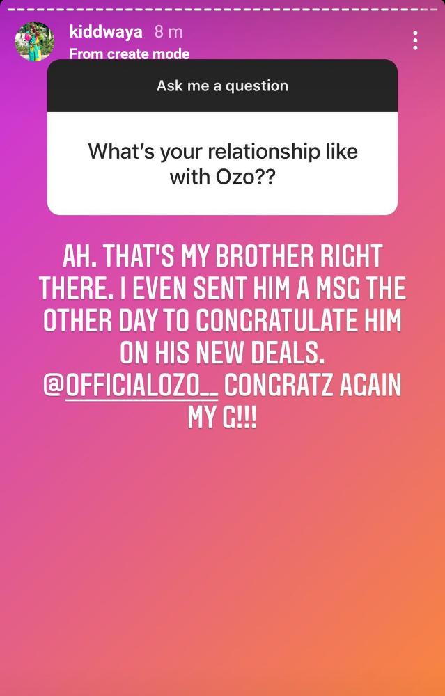 During a question and answer section with his fans after this incident, a fan asked him his relationship with Ozo. Kiddwaya responded and said, “AH. THAT’S MY BROTHER RIGHT THERE”.