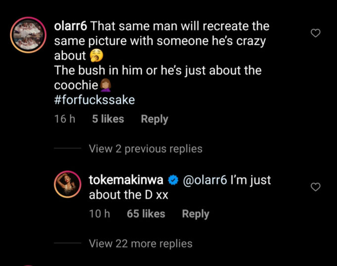 Toke MakinwaToke Makinwa gladly replied to her critics and told the fan she is all about the D**. Hence, there is no problem with her assertion.