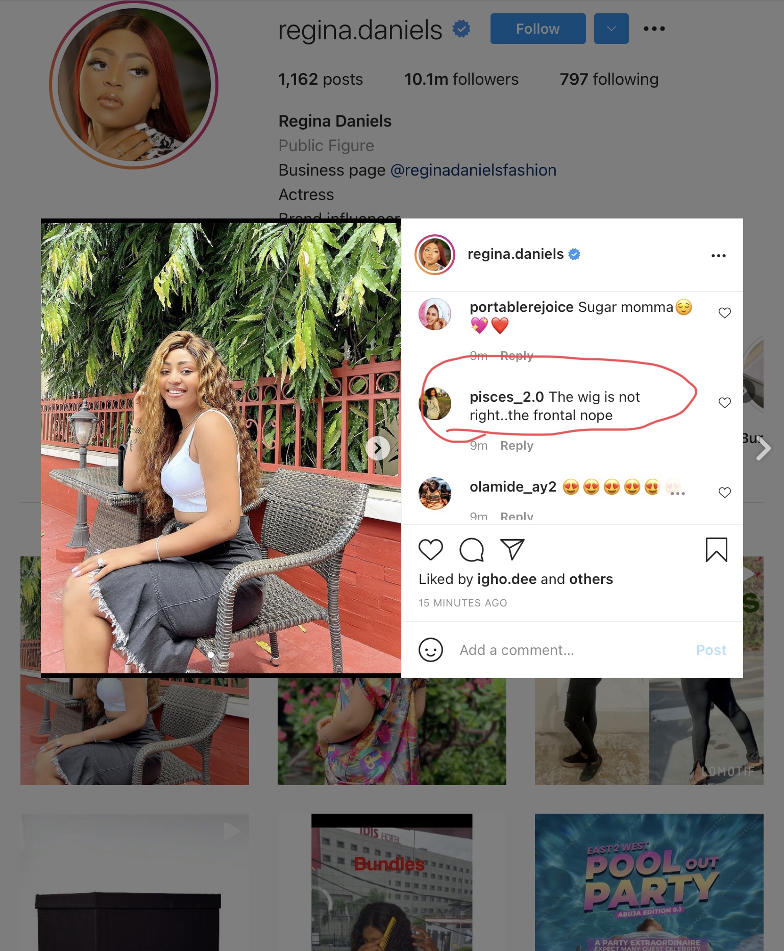 Regina Daniels added to the photo, “find something about yourself that you love on it every day, ”. @Pisces_2.0 wrote under the comment “the wig is not right…the frontal nope.”