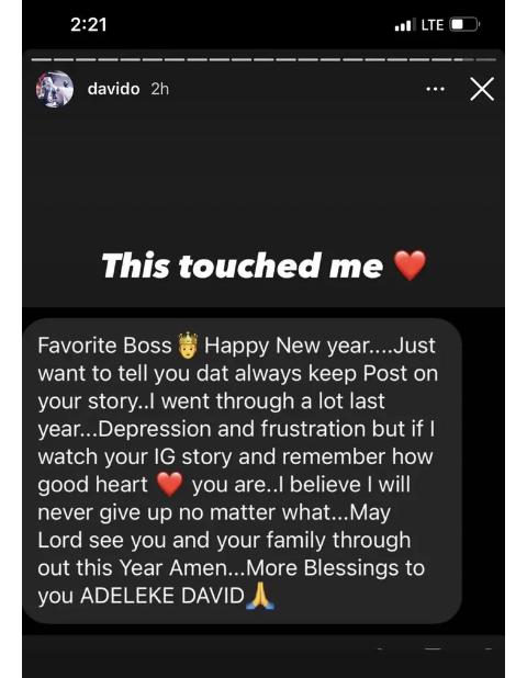 To wish him a happy new year, the fan expressed gratitude to him for being his motivator. He shared an experience of how he got saved from depression because of Davido. In the message, Davido had the applause of having a good heart and sharing things that inspire him on his IG story.