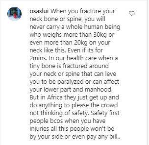 But in Africa they just get up and do anything to please the crowd not thinking of safety. Safety first people bcos when you have injuries all this people won’t be by your side or even pay any bill..”