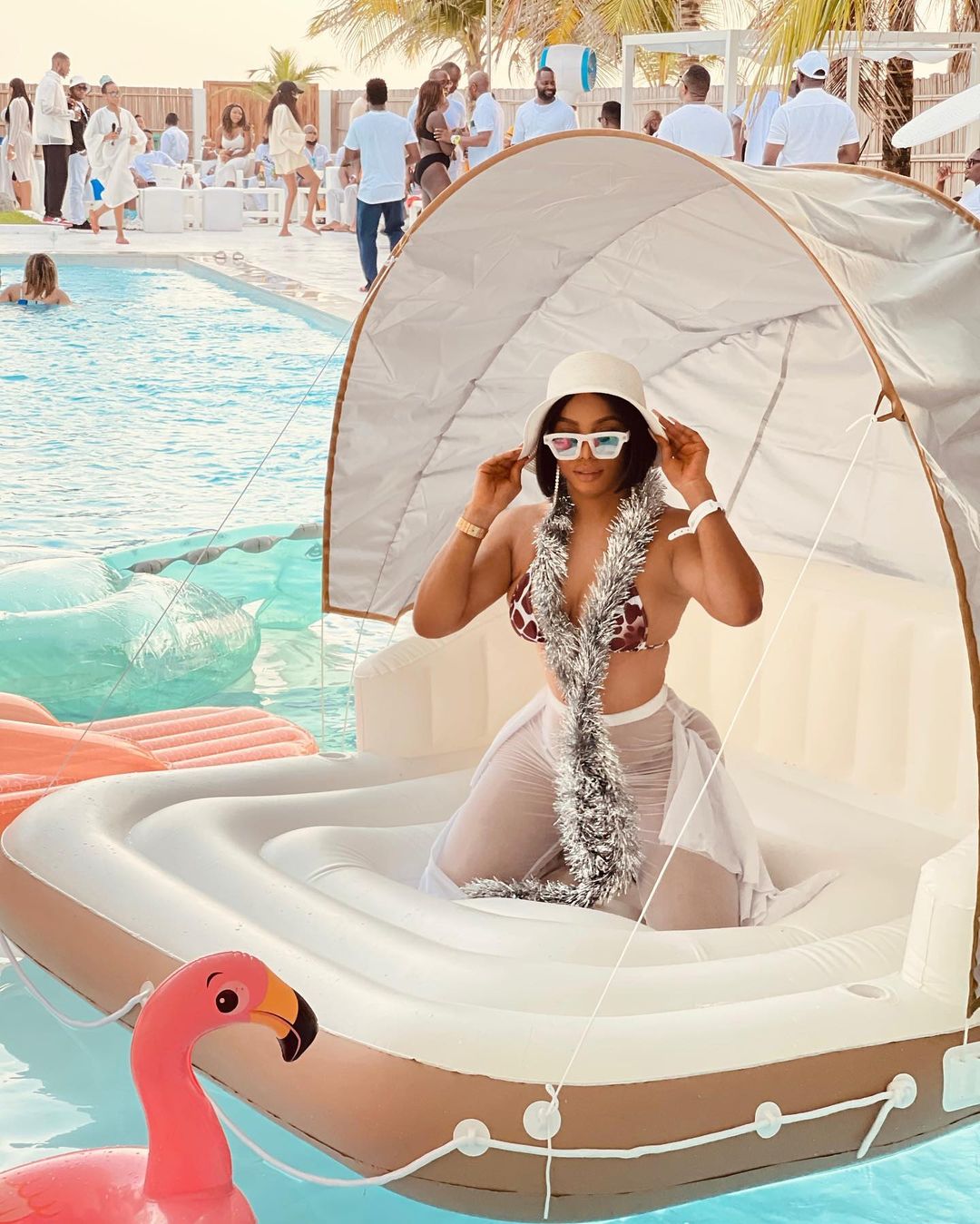 As hot as she always looks, she rocked a white bikini with transparent beach trousers. She wore white sunglasses and a white hat to match her personality. Considering her fashion sense, she displayed her curves and glowing skin as always.