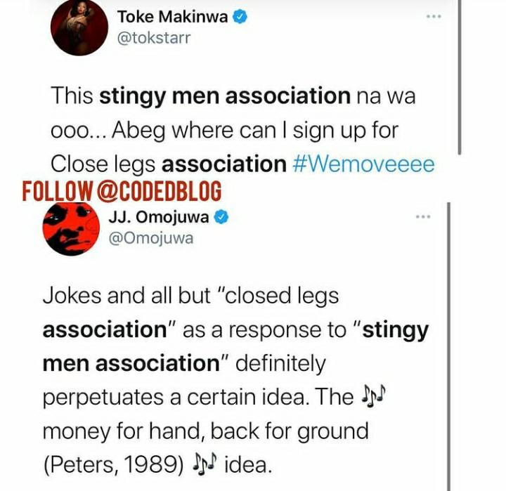 Reacting to how almost all the Nigerian male celebrities are joining the Stingy Men Association, the Nigerian radio personality, television host, vlogger, lifestyle entrepreneur, and author who is known for hosting The Morning Drive on Rhythm 93.7 FM and for her YouTube vlog series Toke Moments, asked where she can also sign up for Close Legs Association.
