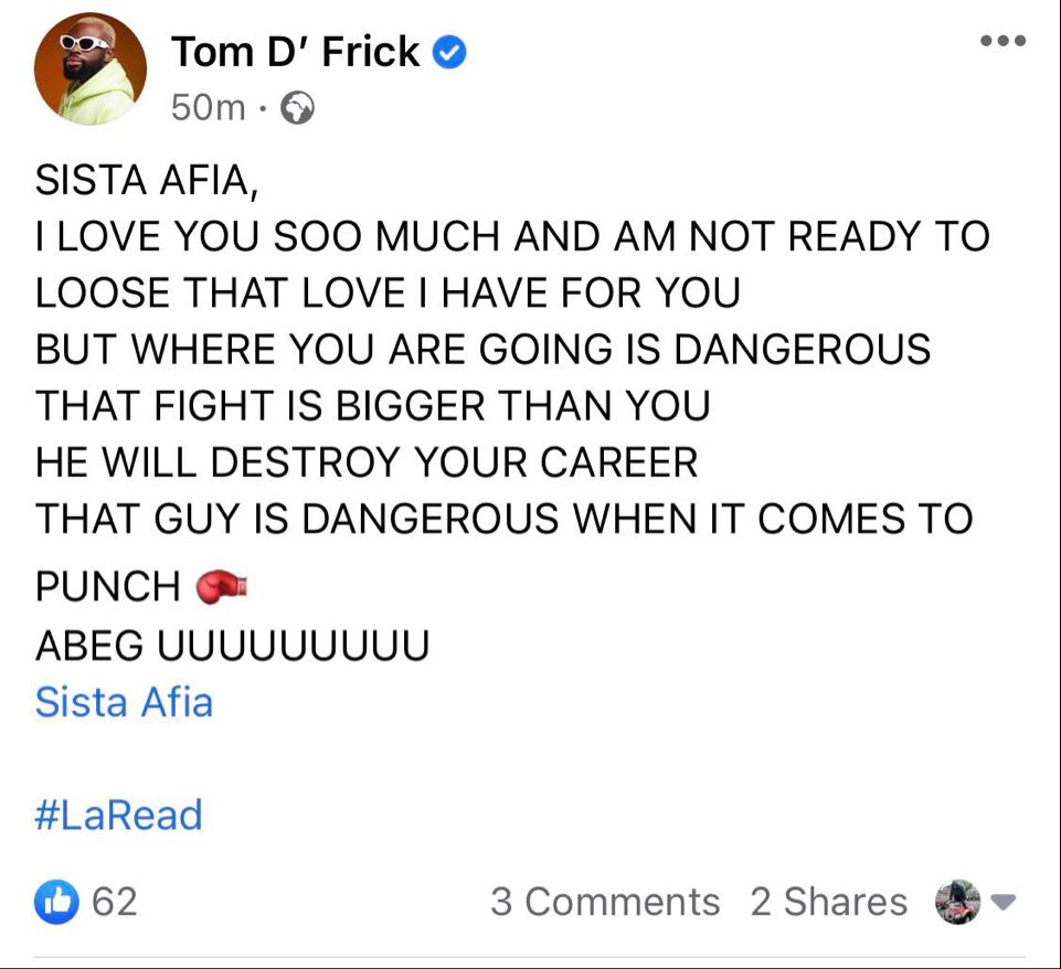 Tom D’Frick added that the game of beefing Yaa Pono is bigger than Sista Afia and it dangerous too. In a Facebook post, he wrote: