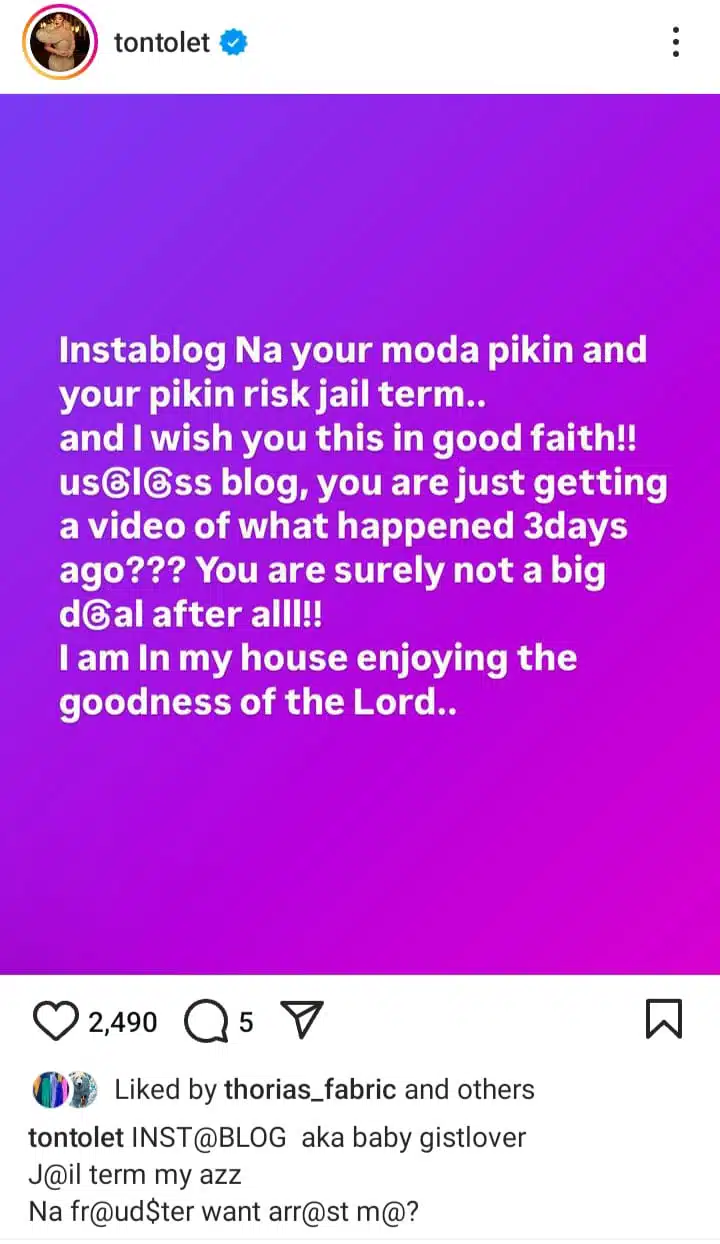 She further mocked Instablog, saying, “Instablog, Na your moda pikin and your pikin risk jail term… useless blog, you are just getting a video of what happened 3 days ago??? You are surely not a big deal after all!! I am in my house enjoying the goodness of the Lord.”