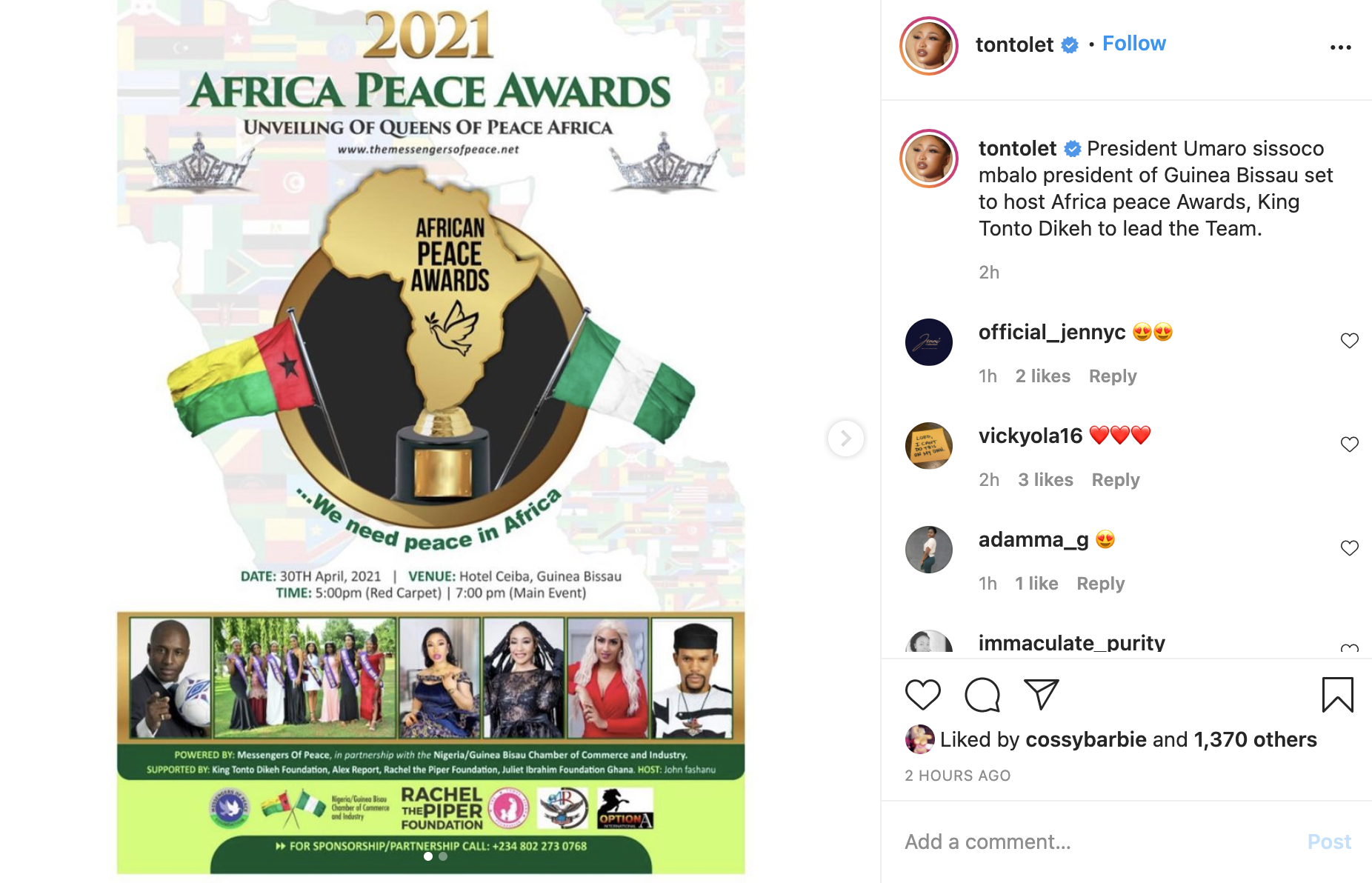 “President Umaro sissoco mbalo president of Guinea Bissau set to host Africa peace Awards, King Tonto Dikeh to lead the Team.”