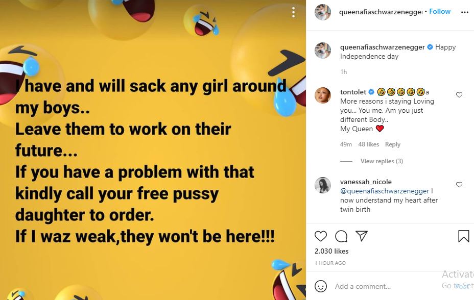 Tonto Dikeh who saw this post commented and said that she loves Afia Schwarzenegger because she thinks exactly like her.