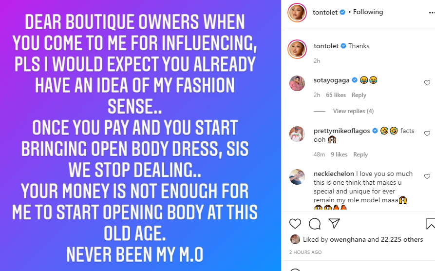 “DEAR BOUTIQUE OWNERS WHEN YOU COME TO ME FOR INFLUENCING, PLS I WOULD EXPECT YOU ALREADY HAVE AN IDEA OF MY FASHION SENSE.. ONCE YOU PAY AND YOU START BRINGING OPEN BODY DRESS, SIS WE STOP DEALING.. YOUR MONEY IS NOT ENOUGH FOR ME TO START OPENING BODY AT THIS OLD AGE. NEVER BEEN MY M.0,” she wrote.