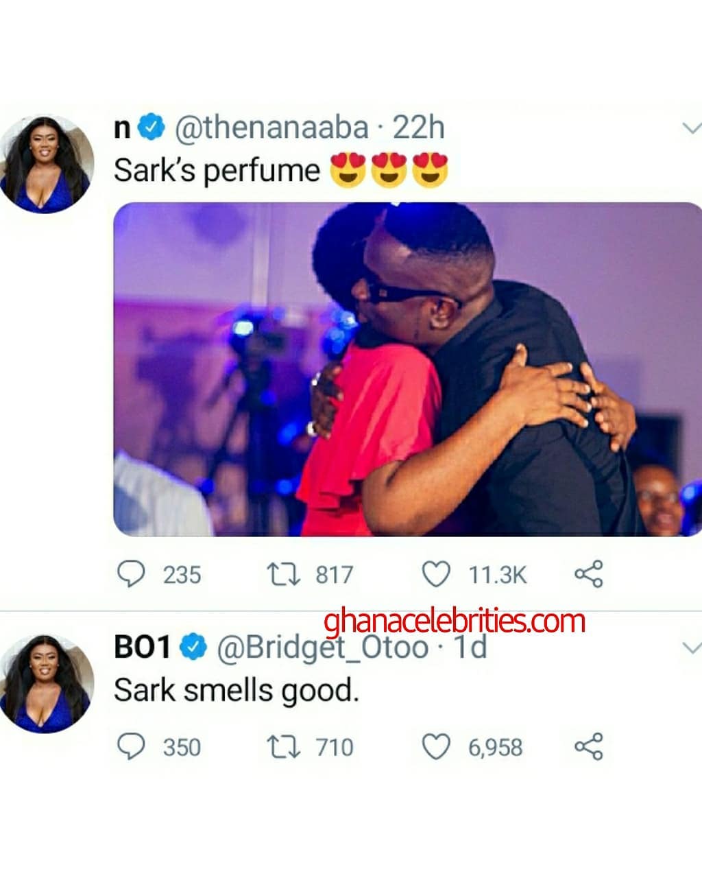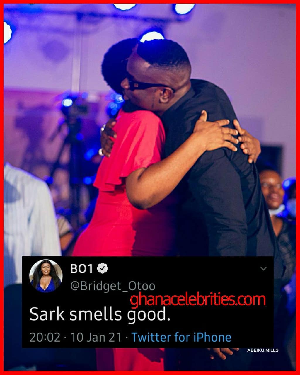 Bridget Otoo posted a photo hugging Sarkodie and tweeted; “Sark’s perfume”.