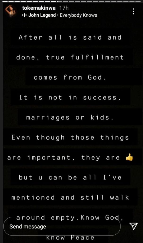 The Nigerian radio personality, television host, vlogger, lifestyle entrepreneur took to her Instagram stories and said God is the only source of true fulfillment and that success, marriage, and kids, even though they are important, do not yield true fulfillment.