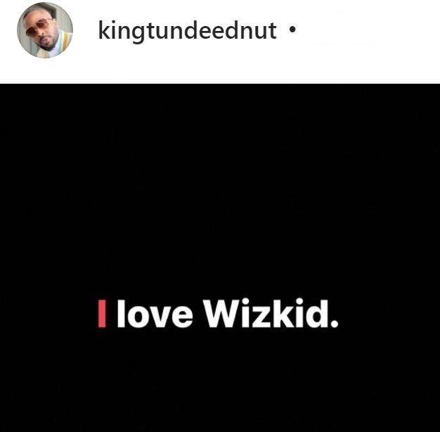 However, Tunde Ednut has finally found love in Wizkid and has declared publicly that he loves the starboy. He made this known in a post sighted on his Instagram story.