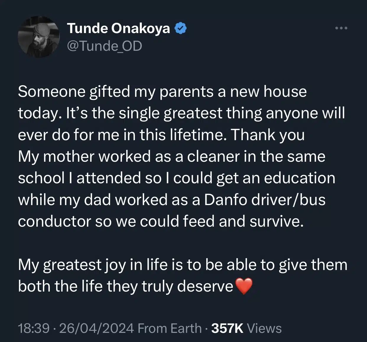 Taking to Twitter to share his joy, Onakoya expressed profound gratitude for the generous act, reflecting on his parents’ support throughout his journey.