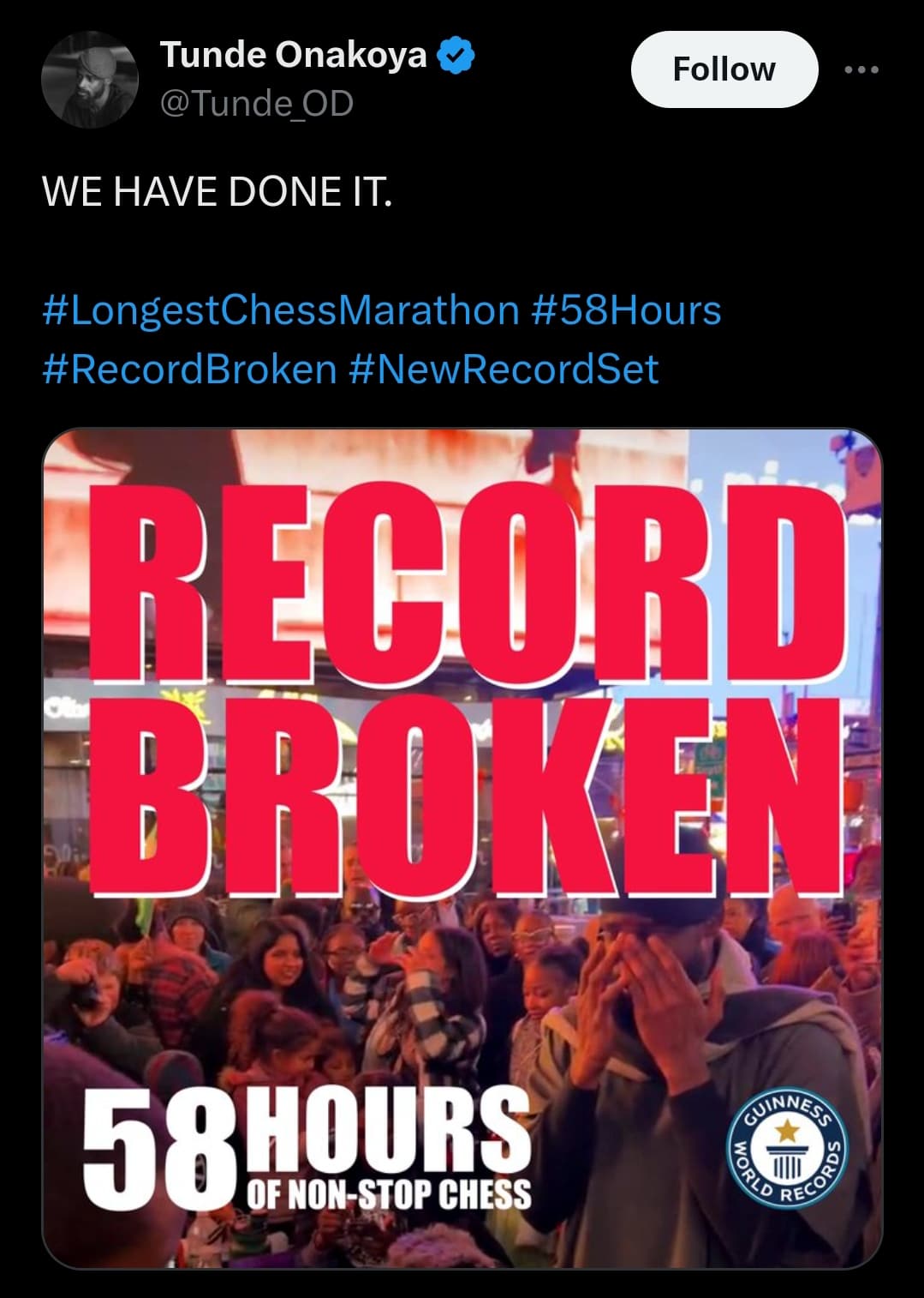 @thatsandragirl The moment Tunde Onakoya clocked the 58th hour 🇳🇬🇳🇬🇳🇬 The current record stands at 56 hours, 9 minutes, and 37 seconds, achieved by Norwegians Hallvard Haug Flatebo and Sjur Ferkingstad in 2018. Tunde is aiming to surpass this record by at least 2 hours. But this isn’t just about breaking records; it’s about shining a global spotlight on Tunde’s impactful work with Chess in Slums Africa (@chessinslums) and raising $1 million to expand access to chess education for millions of children worldwide. Here’s how you can support: 1. Donate to the cause via the link in their bio. 2. Spread the word. Reshare, repost, retweet as many posts about this attempt as possible. 3. Show up at Times Square if you’re in NYC or nearby if you can, he’s currently at 58:13min. You can still show up❤️if you can’t, follow the live update hun. He wants ro add extra two hours to make it 60hours🇳🇬🇳🇬 More enquires for support can be directed to taiwo@tundeonakoya.com or tunde@chessinslumsafrica.com.? For real-time updates, follow Chess in Slums Africa and @thegiftofchess. #impact #socialimpact ♬ original sound – Sandra Adebayo