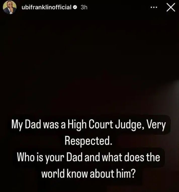 In a now-deleted Instagram story, Ubi Franklin subtly criticized Davido’s former legal advisor by contrasting their fathers’ reputations. Ubi highlighted his father’s esteemed position as a High Court judge while questioning the prominence of Ajudua’s father.