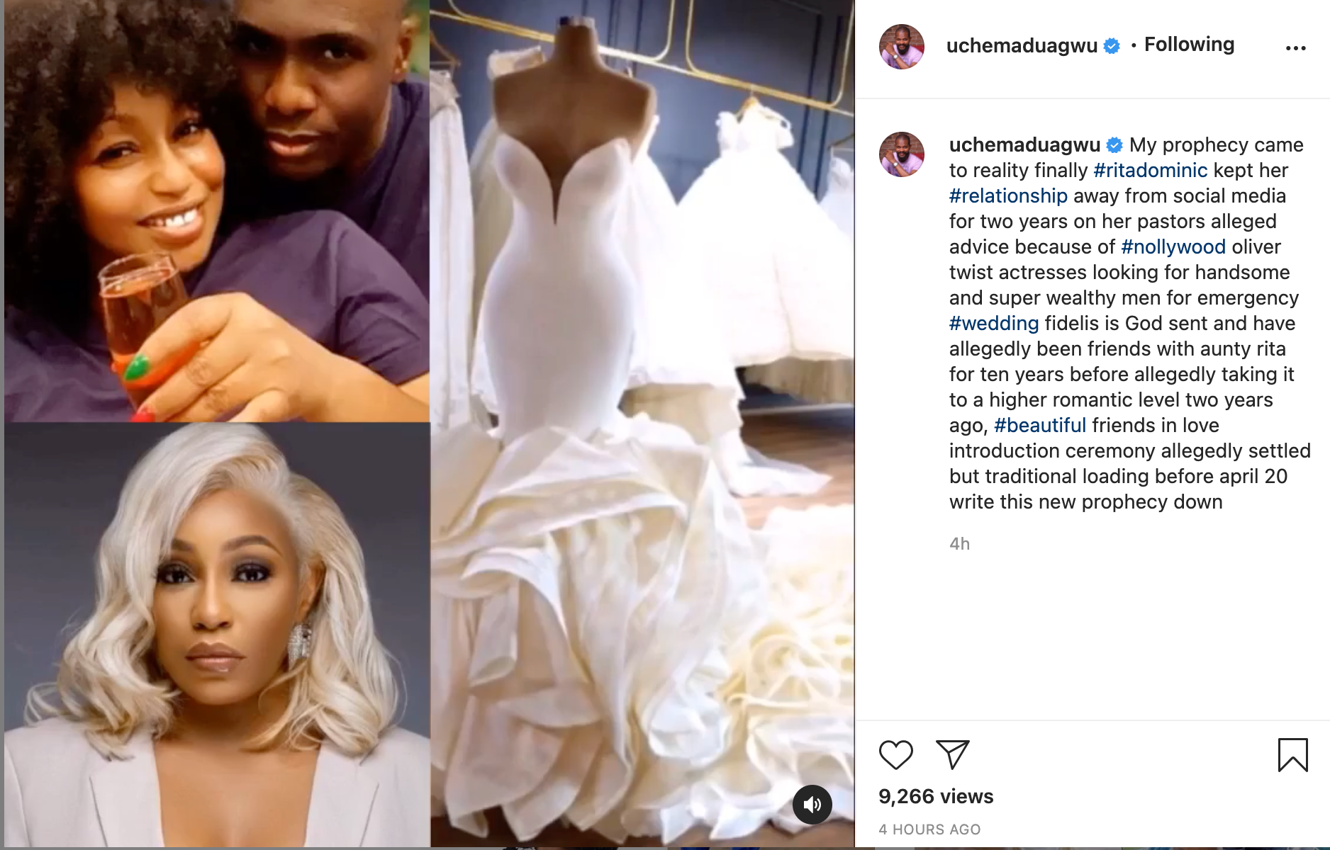 To him, she decided to keep it off social media due to orders from her pastor and to prevent some Nollywood actresses from getting her man away. Uche dropped another prophecy about Rita Dominic and her newfound lover, getting married before April in 2021.