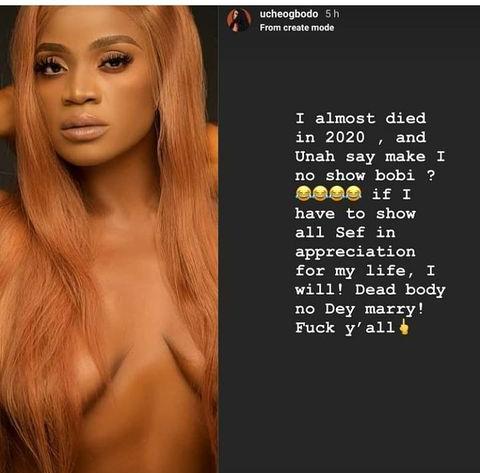 Controversial Nollywood actress, Uche Ogbodo, has divided the reasons for showing her nakedness in public.