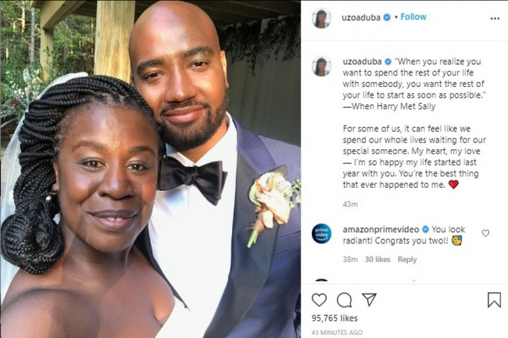 Actress Uzo Aduba of The Orange Is The New Black fame shared a snap of her and her husband on their wedding day as she celebrated her first anniversary last Sunday, September 12, 2021.