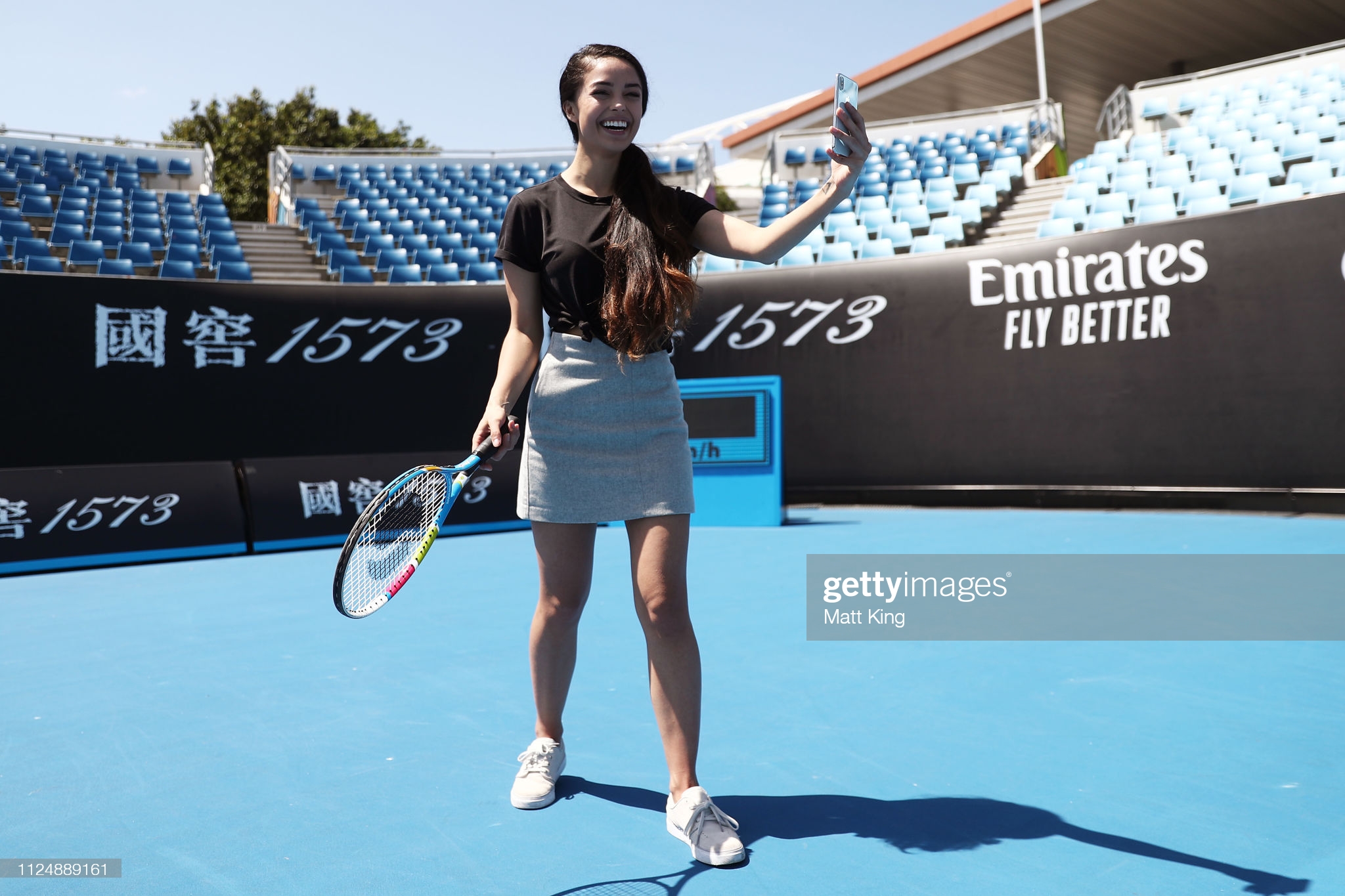 MELBOURNE, AUSTRALIA – JANUARY 26: Gamer Valkyrae plays tennis while taking a selfie ahead of the Fortnite Summer Smash during day 13 of the 2019 Australian Open at Melbourne Park on January 26, 2019 in Melbourne, Australia. (Photo by Matt King/Getty Images)