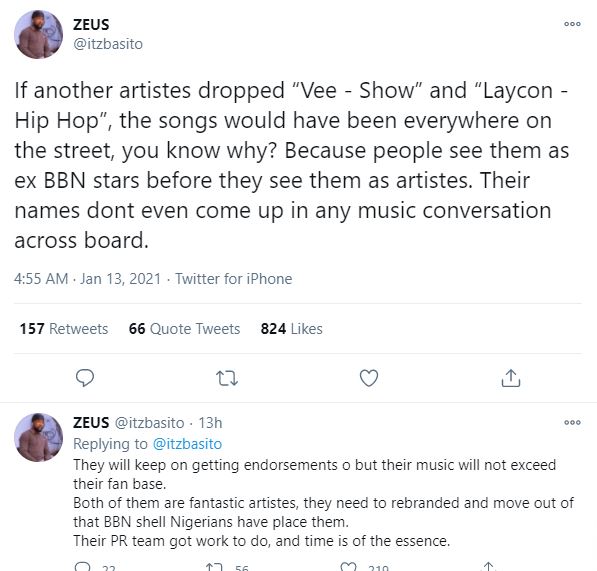 According to him, if any other artists dropped the music Vee and Laycon released recently, it would have been a hit all over the world, because, people still see them as BBNaija stars before they see them as artists.